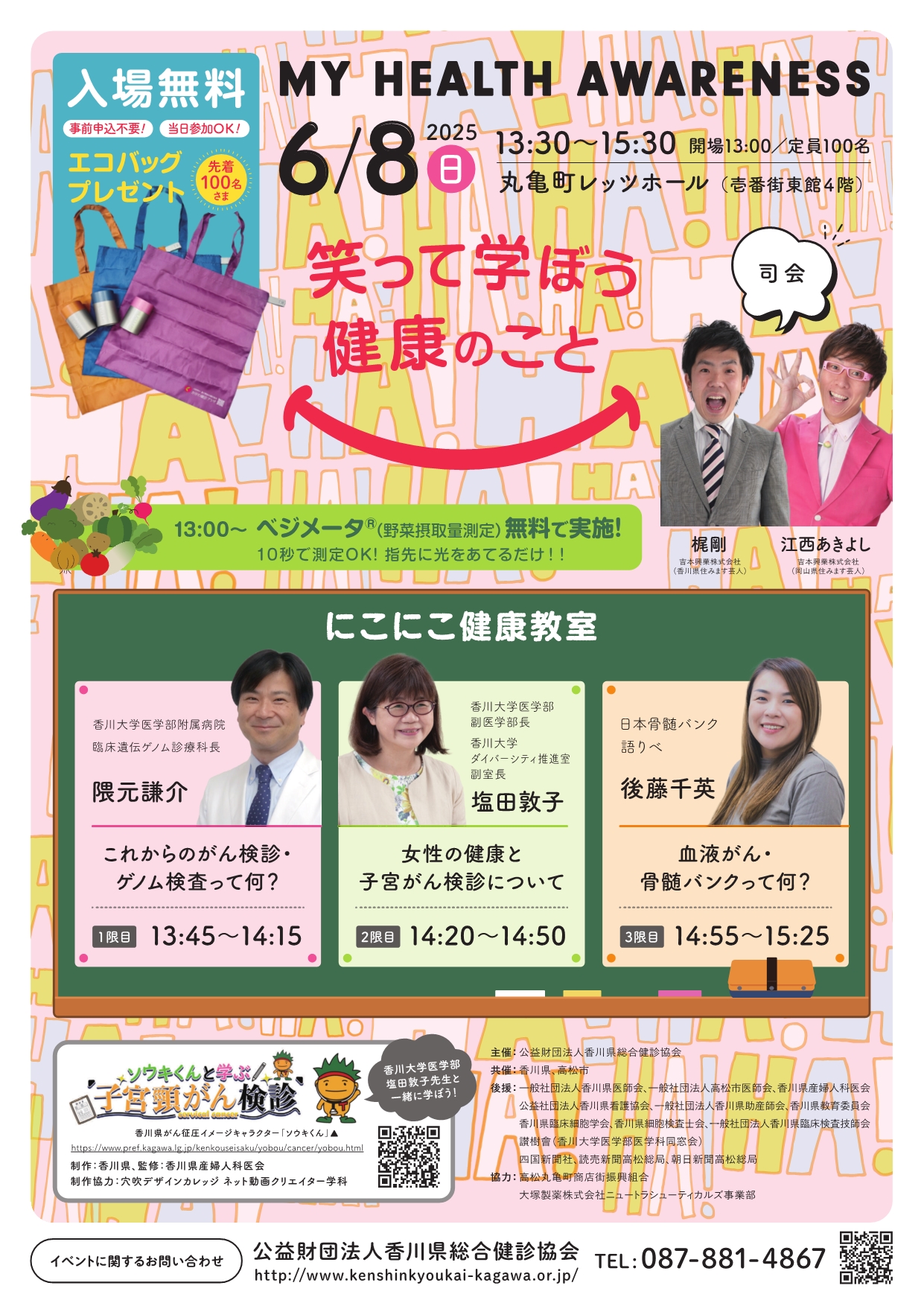 司会に、吉本興業所属の梶剛氏、江西あきよし氏をお迎えし、香川大学の先生等から最近の医療の状況について講義をいただきます。